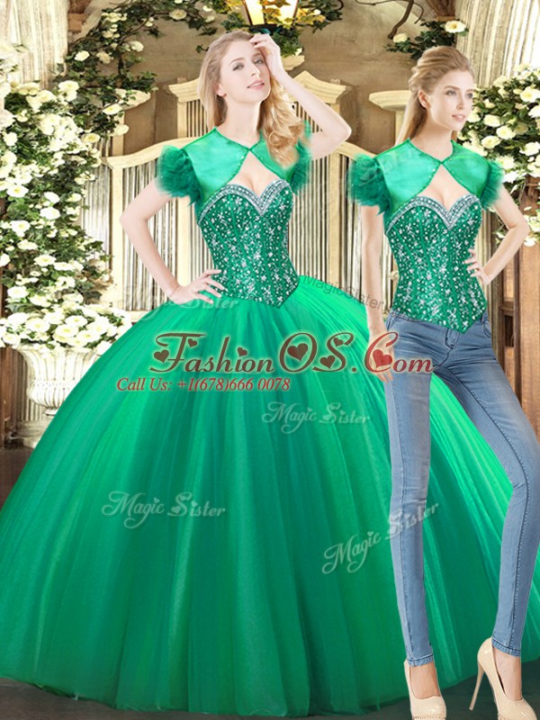 Luxury Green Tulle Lace Up Sweetheart Sleeveless Floor Length Sweet 16 Quinceanera Dress Beading