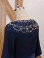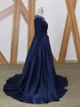 Home >  Special Occasion Dresses >  Elegant Mother of the Bride Dresses > Luxury Navy Blue Mother Of The Bride Dress Scoop 3 4 Length Sleeve Brush Train Zipper