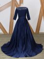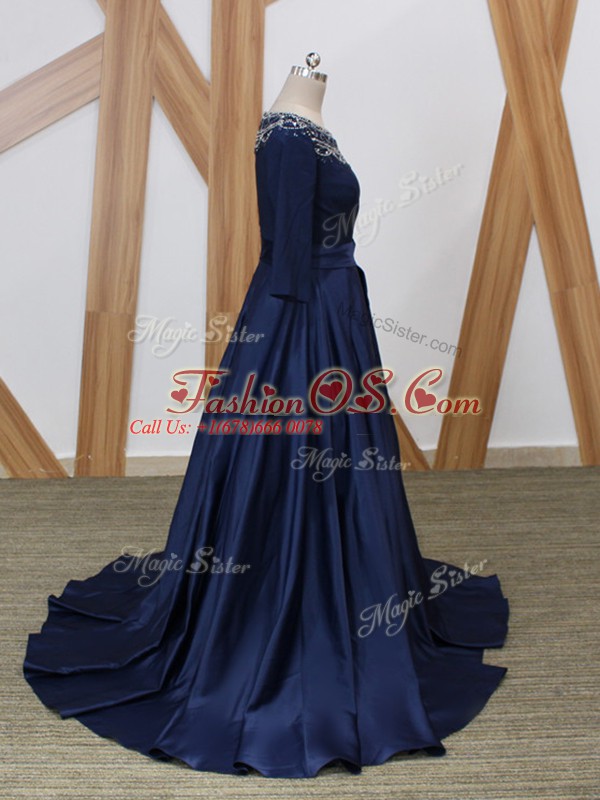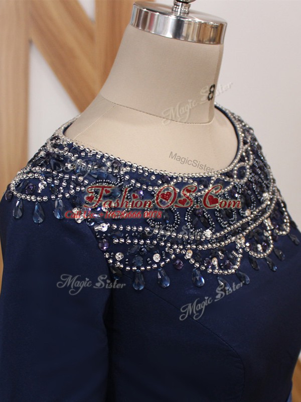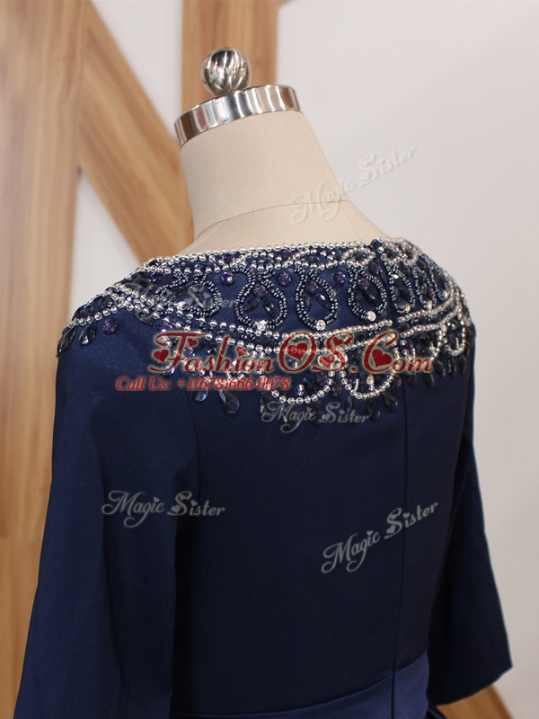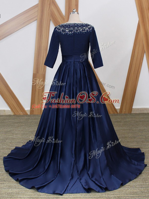 Luxury Navy Blue Mother Of The Bride Dress Scoop 3 4 Length Sleeve Brush Train Zipper