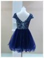 Luxury Navy Blue Zipper Bateau Sequins Dress for Prom Chiffon Cap Sleeves