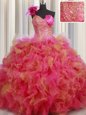 Home >  Quinceanera Dresses >  Custom Made Quinceanera Dresses > Luxury One Shoulder Sleeveless Floor Length Beading and Ruffles and Hand Made Flower Lace Up Quinceanera Dress with Multi-color