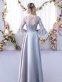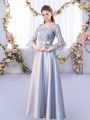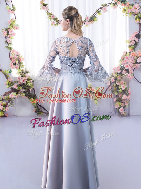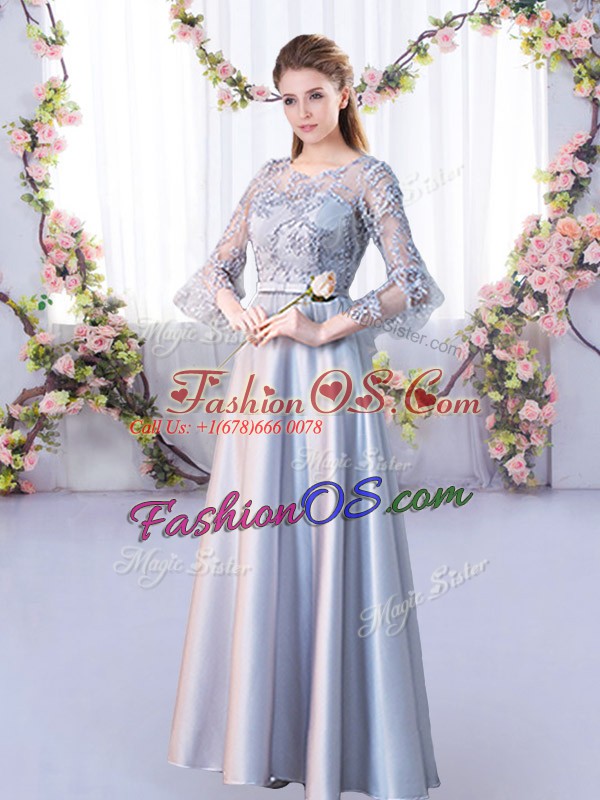 Luxury Silver Satin Lace Up Scoop 3 4 Length Sleeve Floor Length Bridesmaid Dress Lace