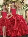 Luxury Sleeveless Organza Floor Length Lace Up Quince Ball Gowns in Red with Ruffles