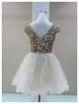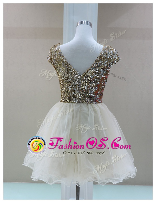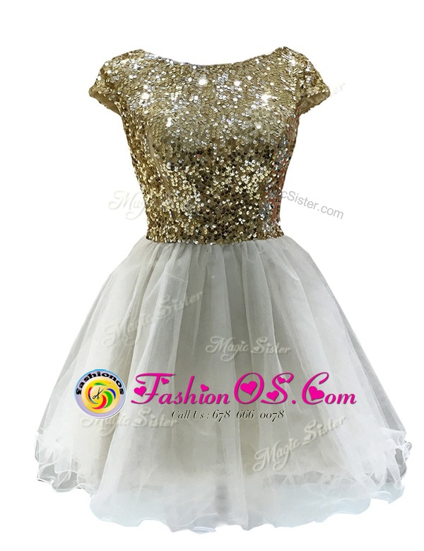 Luxury White A-line Bateau Cap Sleeves Chiffon Mini Length Zipper Sequins Celebrity Inspired Dress