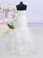 Mermaid Beading and Ruffled Layers Wedding Dresses White Lace Up Sleeveless With Brush Train