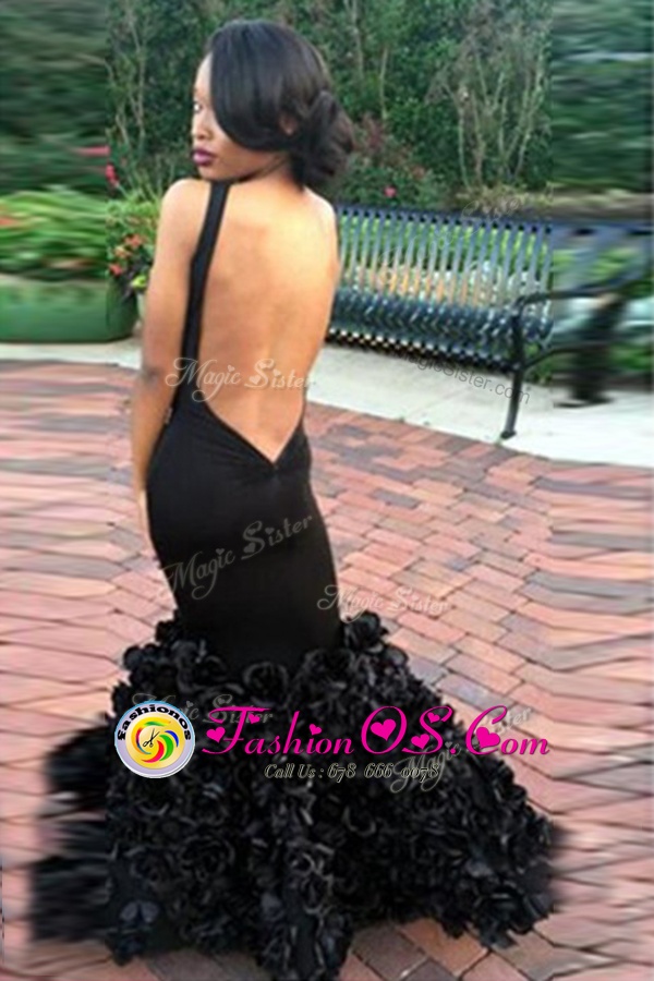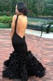 Mermaid Black Backless Scoop Lace Prom Dresses Satin Sleeveless