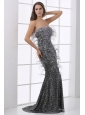 Home >  Prom Dresses >  Elegant Prom Dresses > Mermaid Black Festher Strapless Sequins Brush Train Prom Dress