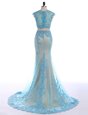 Mermaid Blue Zipper Dress for Prom Lace Sleeveless With Brush Train