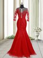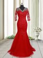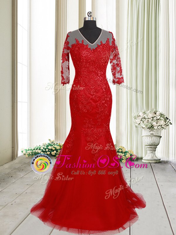 Mermaid Clasp Handle V-neck Half Sleeves Homecoming Dress With Brush Train Lace Red Tulle