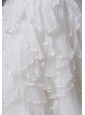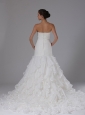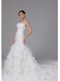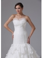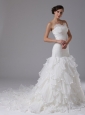 This white strapless wedding dress has very refined pleated waistline and hipline. The floral design on the bust add the sassy look also make you look special. The trumpet of the Mermaid skirt is made of layers of gathered organza, which has an amazing shape and creates a beautiful silhouette. A stunning cathedral-length train extends from the back of the dress and a zipper-style closure completes the design.