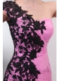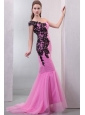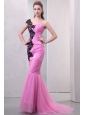 Mermaid One Shoulder Rose Pink Appliques and Ruching Brush Train Prom Dress