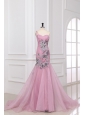 Mermaid One Shoulder Rose Pink Appliques Ruching Organza Long Prom Dress