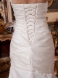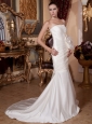 This wedding dress have a charm and beauty all their own and are flattering to just about any body type. This fancy gown is an example of what we mean. It has a one beaded strap bodice with heavily ruched fabric which adds a touch of softness. What's more the appliques and hand flowers on the dress makes you more elegent. The mermaid-style skirt is made in a series of ruffled tiers in the back that cascade down the hem, together with the wavy train creating a beautiful effect.