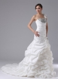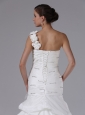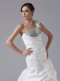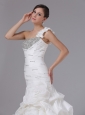 This fabulous mermaid style wedding dress embellished with a elegant one shoulder neckline. The bodice has a pleated and floral single strap style, beadings are all over the skirt. The soft and fishtail skirt is floor length with rolling flowers which adds the charm off the dress. As graceful, chic and luxury as it can get, this stunning wedding dress has a court train and is perfect for venues such as outdoor, ballroom and hall in the seasons of spring, fall and summer.