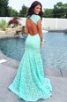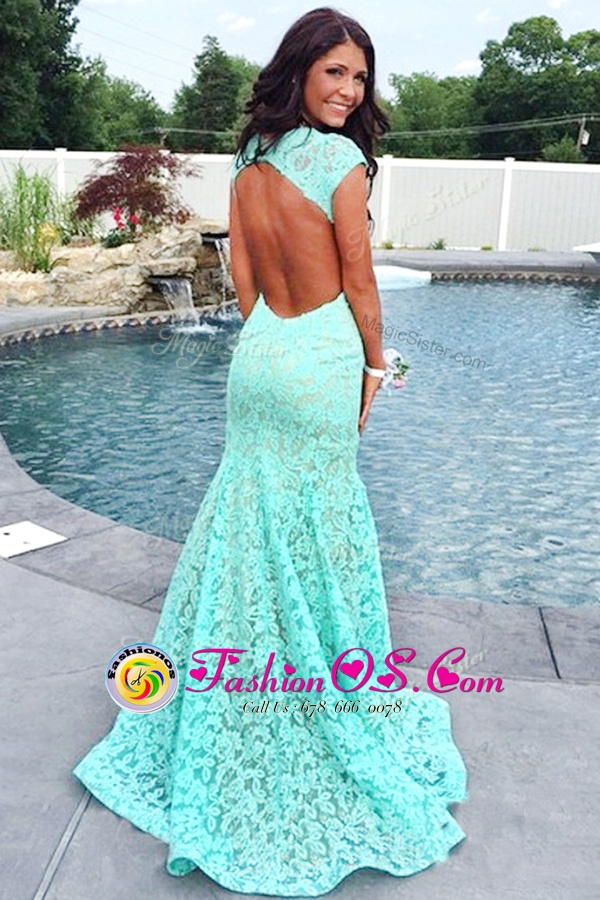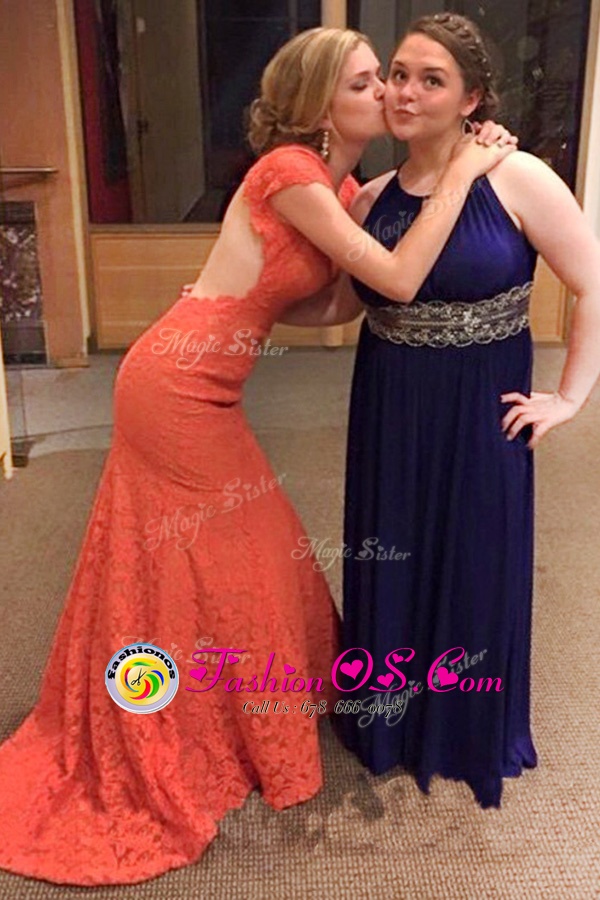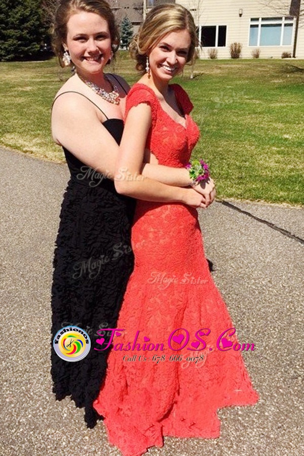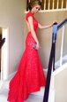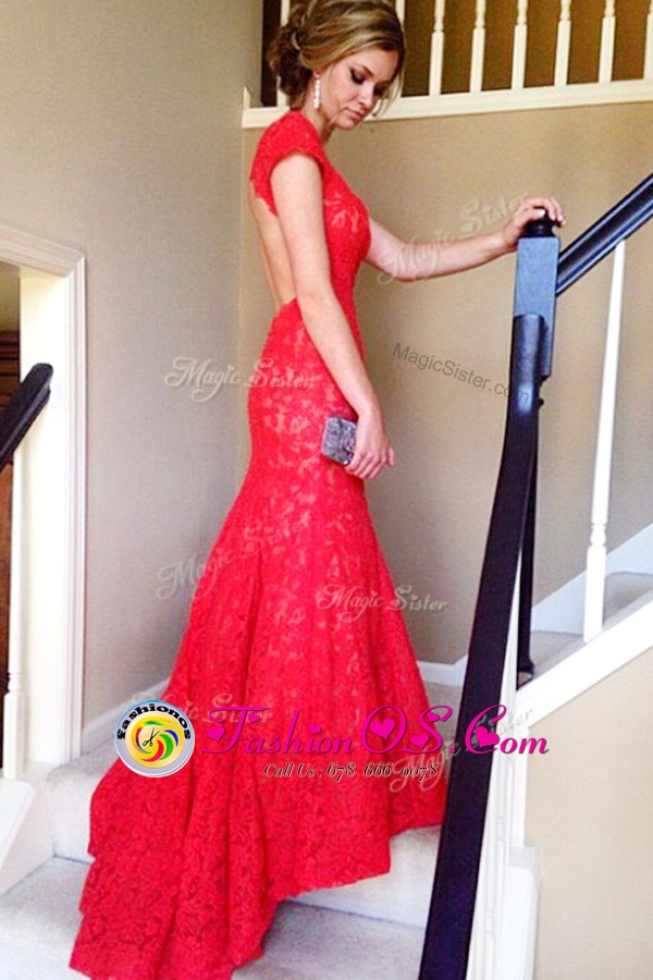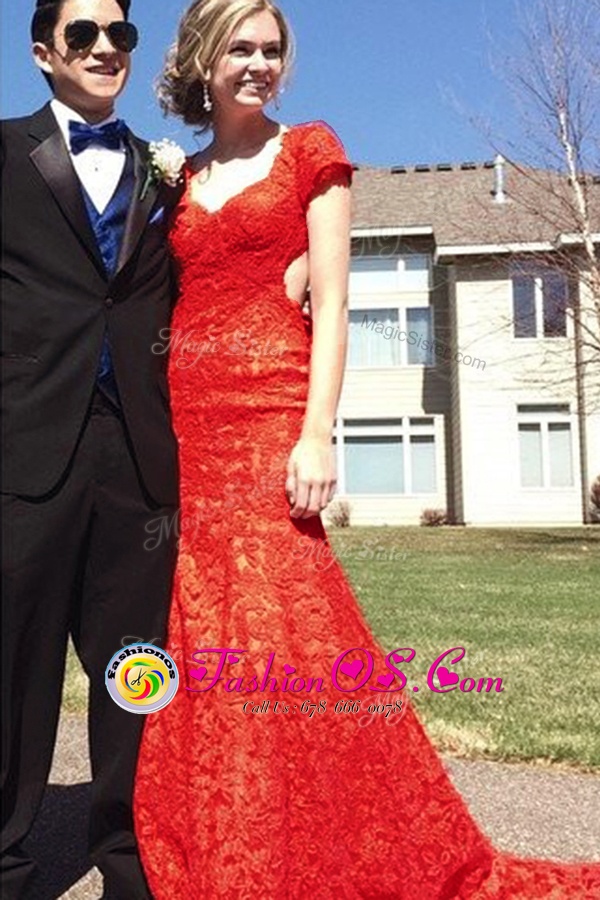 Mermaid Red Prom Dresses Prom and Party and For with Lace V-neck Short Sleeves Sweep Train Backless