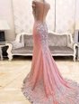 Mermaid Rose Pink Clasp Handle Prom Evening Gown Beading and Appliques Cap Sleeves With Train Watteau Train