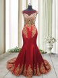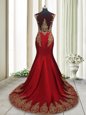 Mermaid Scoop Cap Sleeves Elastic Woven Satin With Brush Train Side Zipper Evening Dress in Red for with Appliques