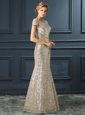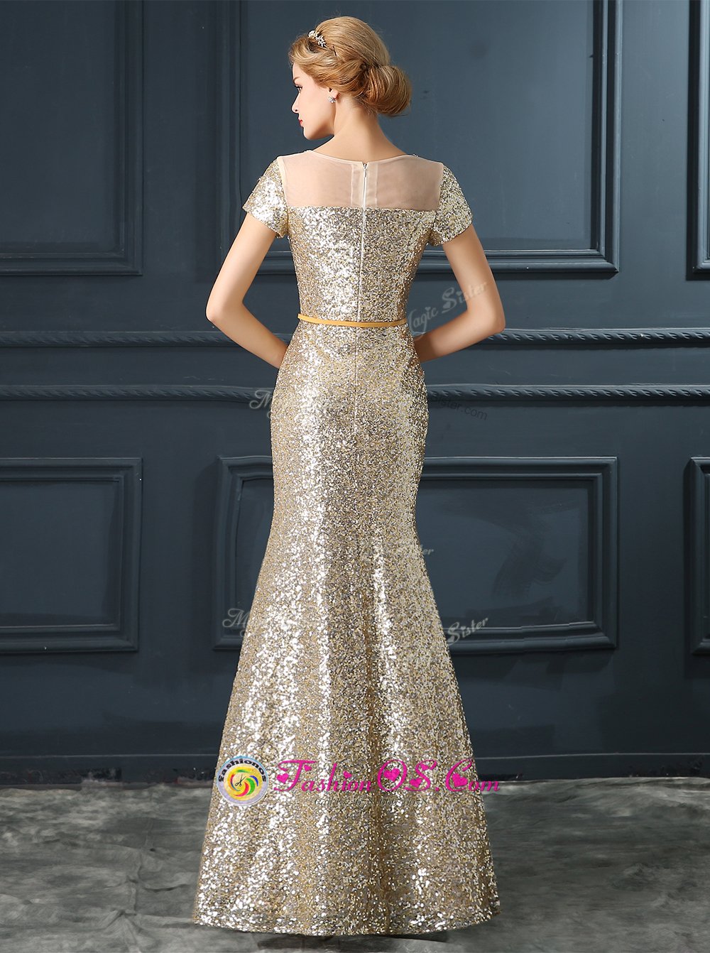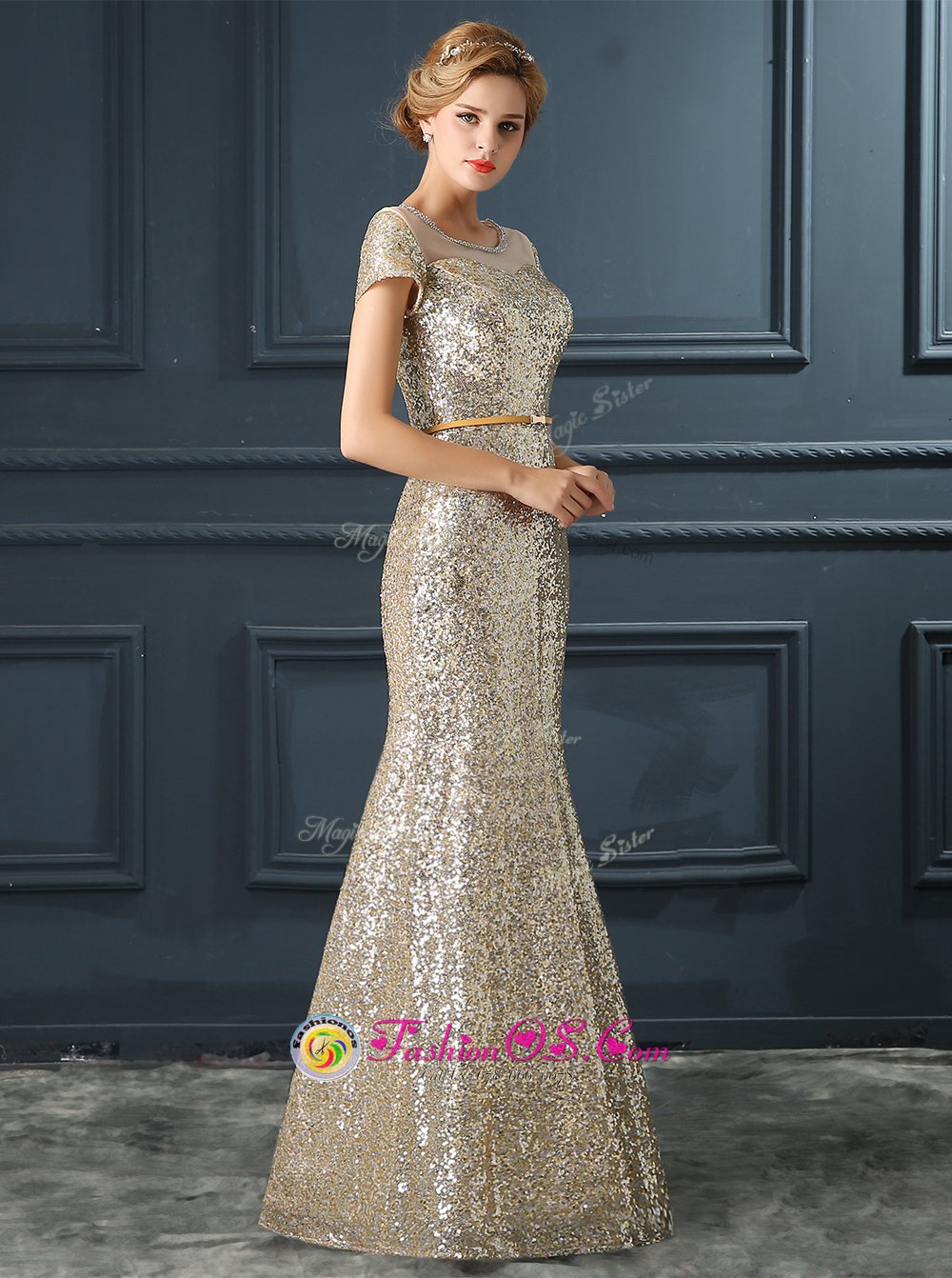 Mermaid Scoop Cap Sleeves Sequined Floor Length Zipper Red Carpet Gowns in Champagne for with Sequins and Belt