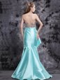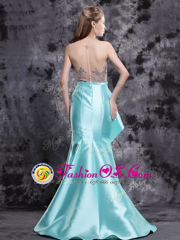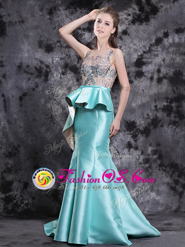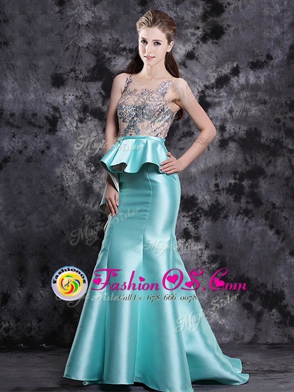 Mermaid Scoop Sleeveless Satin Red Carpet Gowns Appliques Brush Train Zipper