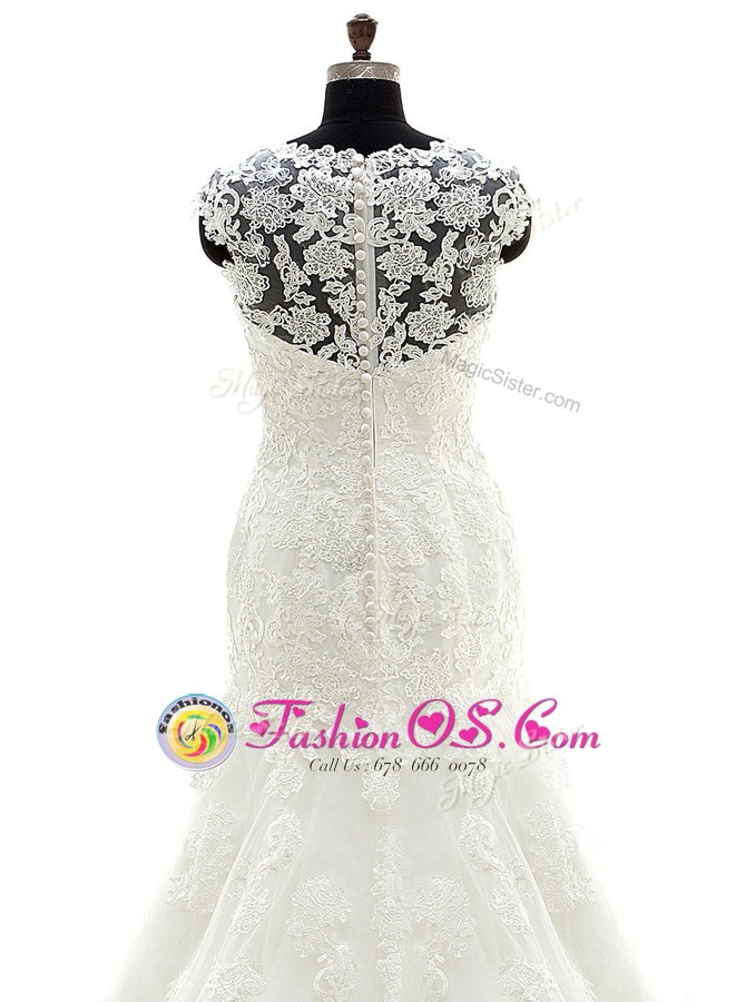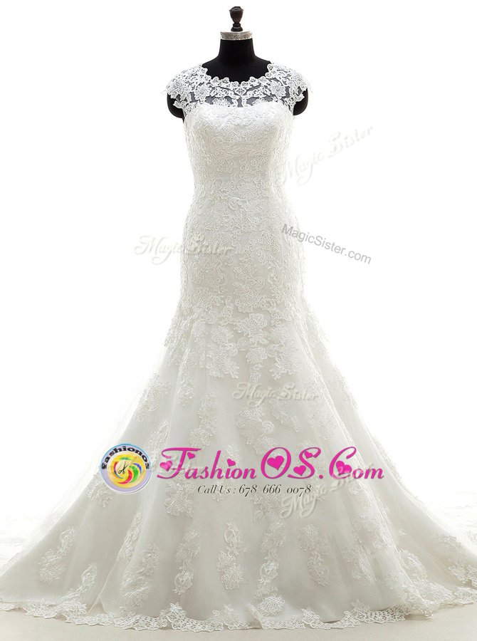 Mermaid Scoop With Train White Wedding Gown Lace Court Train Sleeveless Appliques