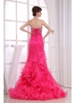 Mermaid Strapless Brush / Sweep Beading Organza Prom Dress Hot Pink