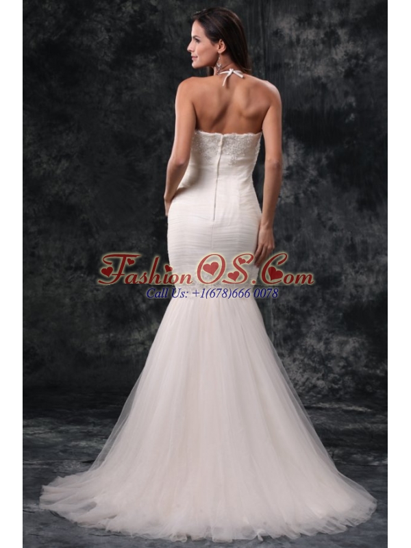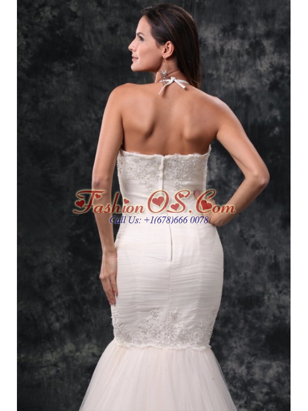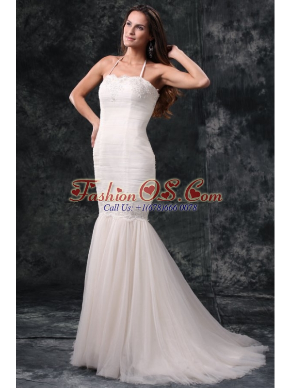 Mermaid Straps Brush Train Organza Appliques and Ruching Wedding Dress