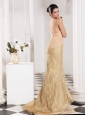 Mermaid Straps Champagne Appliques and Beading Brush Train Prom Dress