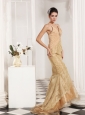 Home >  Prom Dresses >  Elegant Prom Dresses > Mermaid Straps Champagne Appliques and Beading Brush Train Prom Dress