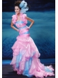 This prom dress is very exquisite. It features strapless neckline with beading. The dress is multi-color , including aqua blue and pink. The skirt is mermaid and it features many tiers of ruffles.