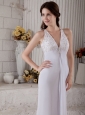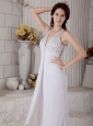 This classic wedding gown is a flawless look for a formal event. This gown is sleeveless with a V-neck halter top neckline trimmed in fine jewels and appliques. A sheer lace on the back add the sexy effect. This gown is fitted through the bodice and boasts an A-line skirt. In the frount a loose material hang from the bust and create a breaty look when you move. It’s a stunning look for pictures that will capture your special day.