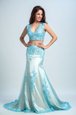 Silhouette: Mermaid Neckline: v-neck Sleeve Length: sleeveless Hemline/Train: with train Back Detail: zipper Embellishment: beading,pattern Fabric: chiffon Shown Color: blue and white(Color & Style representation may vary by monitor.) Occasion: prom Season: spring,summer,fall,winter Fully Lined: Yes Built-In Bra: Yes