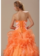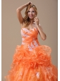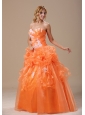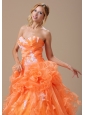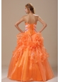 Fairytale-inspired dresses will always be popular because every girl dreams of being a princess. This orange quinceanera dress is the stunning example.It features a strapless bodice with a sweetheart neckline and some scattered embroidery.The ruching on the bodice and the chic flowers in the waist area are so exquisite and dainty that can also defines your slim curve.The A-line skirt features two tiers.The top one is comprised of lots of ruffles, ribbons and flower ,while the underskirt is made from the stunning fabric.The lace up back secures the dress and completes this wonderful design. You will be sure the shimmering star in the party.