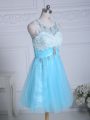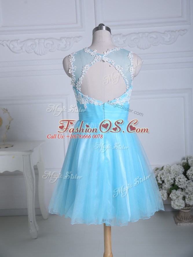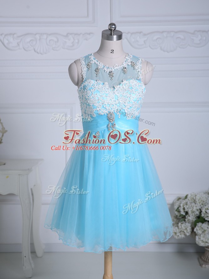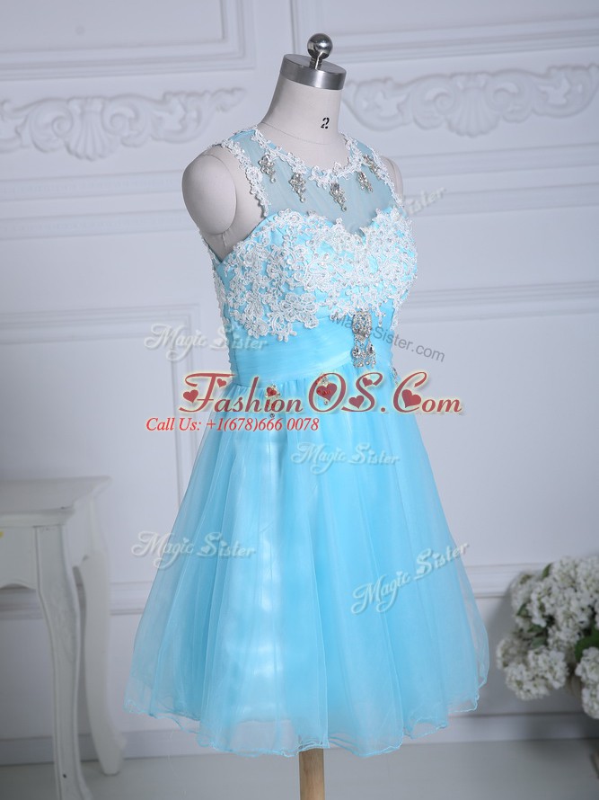 Mini Length Aqua Blue Club Wear Organza Sleeveless Lace and Appliques