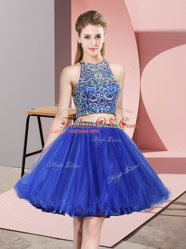 Mini Length Backless Quinceanera Court of Honor Dress Royal Blue for Prom and Party and Wedding Party with Beading