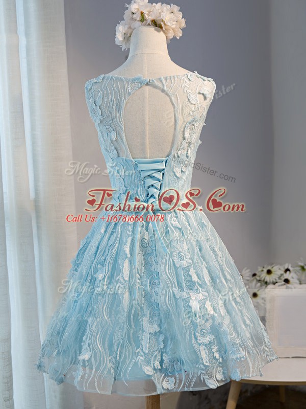 Mini Length Light Blue Party Dresses Tulle Sleeveless Lace and Appliques