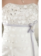 This beautiful, yet captivating wedding gown features many designer details. The strapless bodice is with petaloid appliques and beadings accent throughout the whole skirt. A silver thin sash with a lovely bow on adorns the midsection of the dress. The A-line skirt is flowy with a sweeping train trails elegantly behind. The back is interlaced in a flat way which highlights the design.