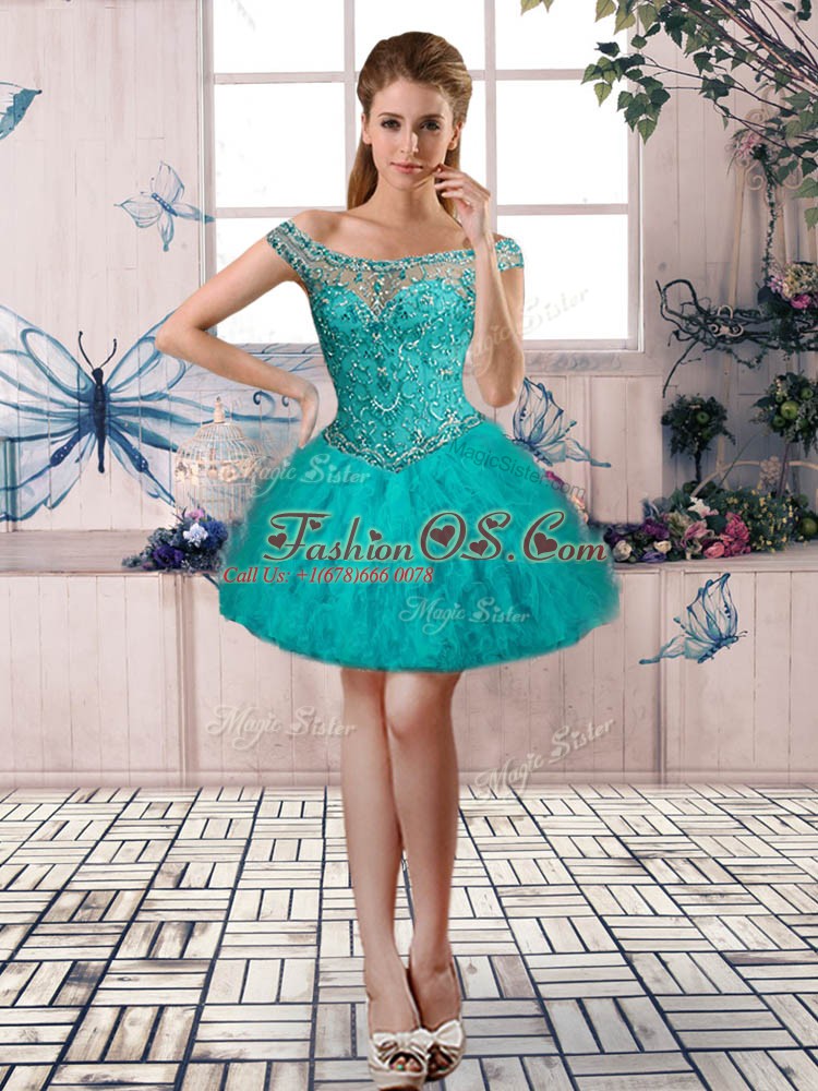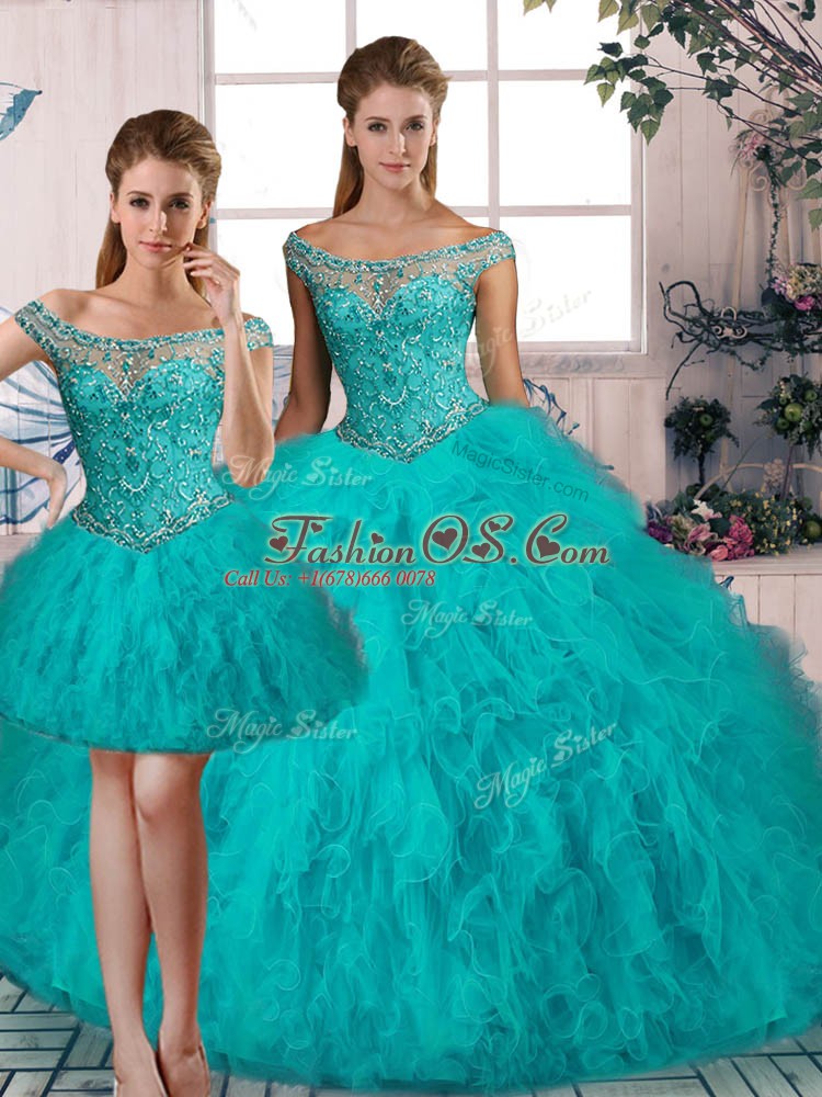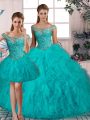 Modern Aqua Blue Sleeveless Beading and Ruffles Lace Up Quinceanera Gown