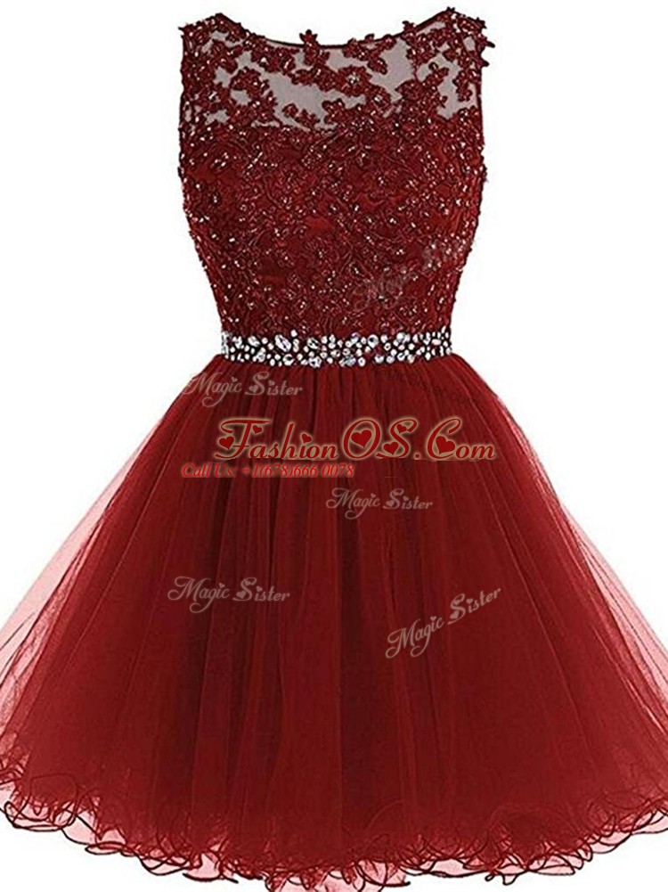 Modern Burgundy A-line Tulle Scoop Sleeveless Beading and Lace and Appliques Mini Length Zipper Prom Evening Gown
