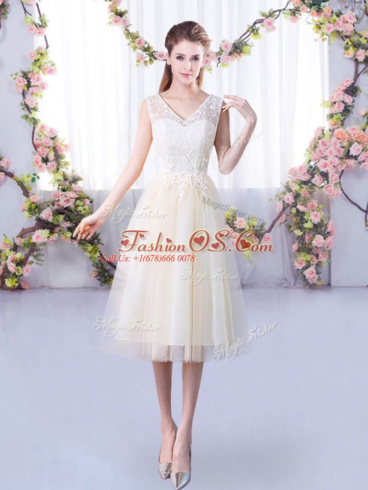 Modern Champagne Empire Tulle V-neck Sleeveless Lace Tea Length Lace Up Dama Dress