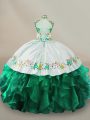 Modern Dark Green Ball Gowns Organza Halter Top Sleeveless Embroidery Floor Length Lace Up Ball Gown Prom Dress