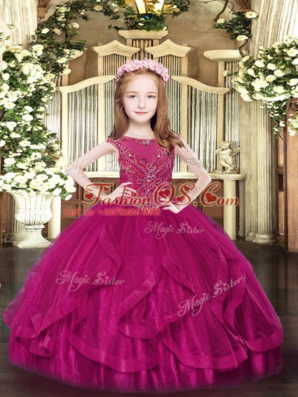 Home >  Special Occasion Dresses >  Pretty Little Girl Pageant Dresses > Modern Fuchsia Sleeveless Floor Length Beading and Ruffles Zipper Little Girls Pageant Dress Wholesale