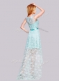 Modern High Low Belted and Laced Apple Green Prom Dress with Bateau
