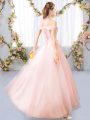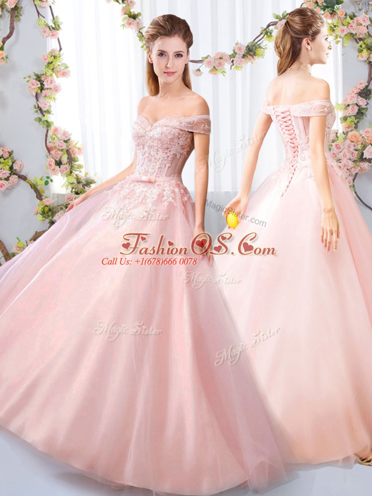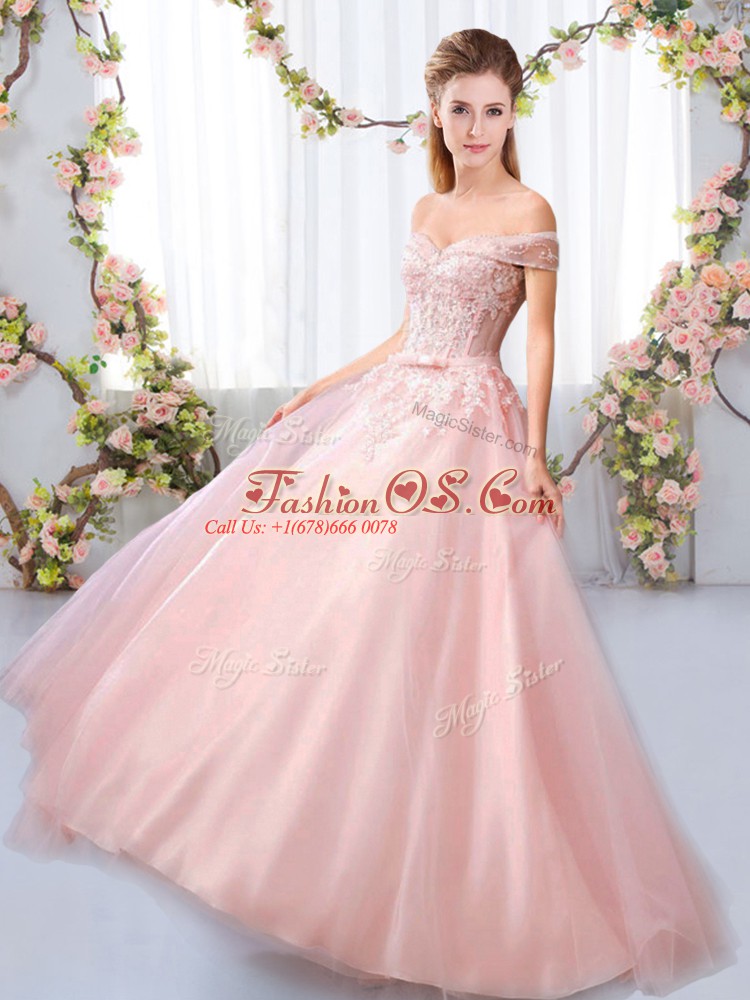 Modern Pink A-line Off The Shoulder Sleeveless Tulle Floor Length Lace Up Appliques and Belt Quinceanera Dama Dress