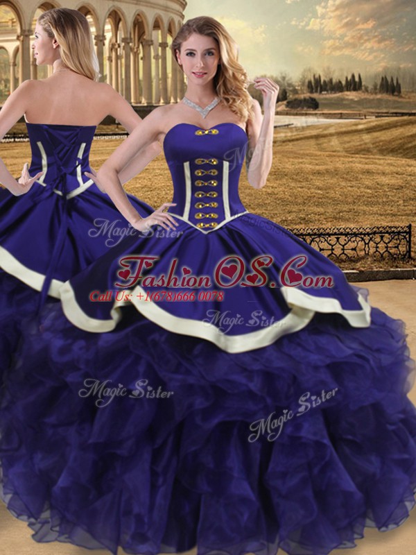 Modern Purple Ball Gowns Sweetheart Sleeveless Satin Floor Length Lace Up Beading and Ruffles Quinceanera Gowns