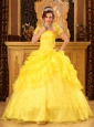 Be the belle of the ball in this fabulous red a-line.It has a strapless bodice with a gathered applique folwers and a row of ruffles on the bustline. The corset style bodice is finished with a lace up tie back. The special A-line skirt is full and shapely,thanks to many layers of satin and organze-like fabric.