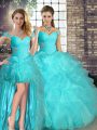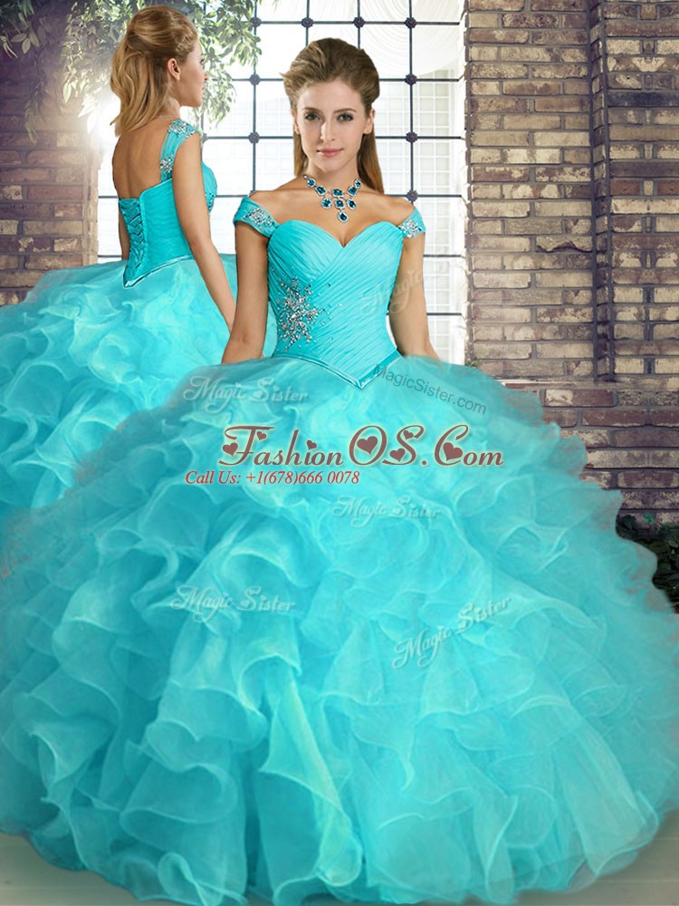 Modern Three Pieces Quince Ball Gowns Aqua Blue Off The Shoulder Organza Sleeveless Floor Length Lace Up