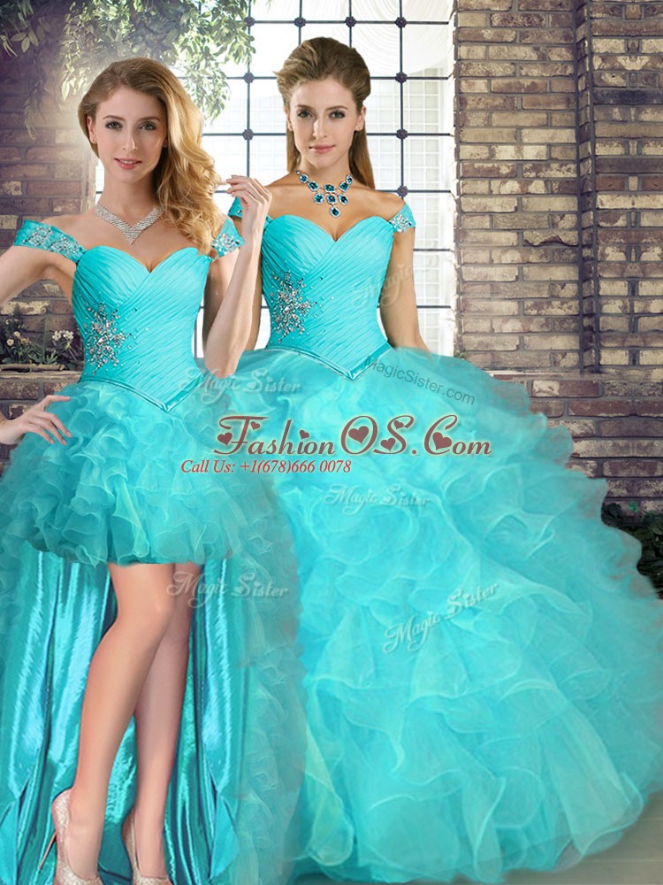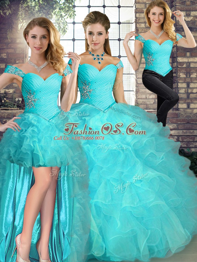 Home >  Quinceanera Dresses >  Detachable Quinceanera Skirts > Modern Three Pieces Quince Ball Gowns Aqua Blue Off The Shoulder Organza Sleeveless Floor Length Lace Up