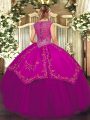 Modern V-neck Sleeveless Quinceanera Gowns Floor Length Beading and Embroidery Fuchsia Taffeta and Tulle