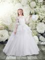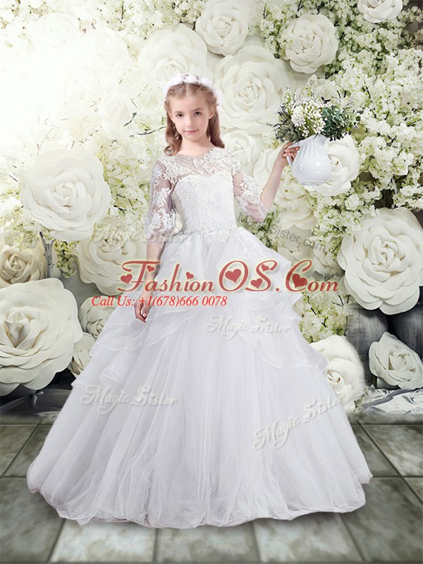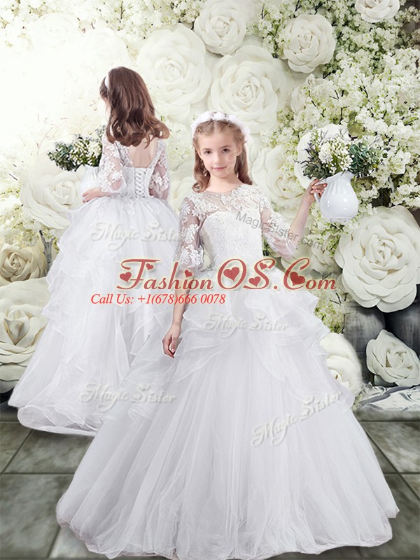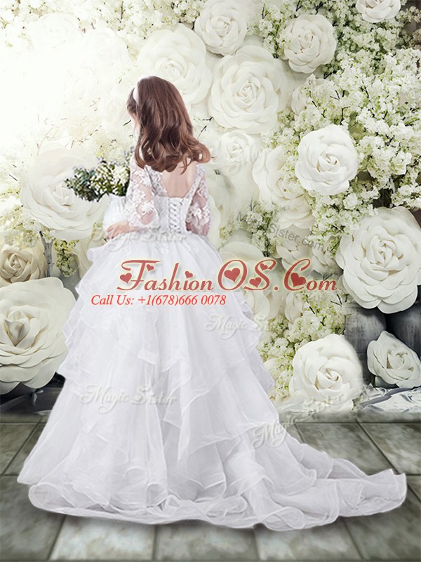 Modern White Tulle Lace Up Flower Girl Dresses for Less Half Sleeves Brush Train Lace and Ruffles