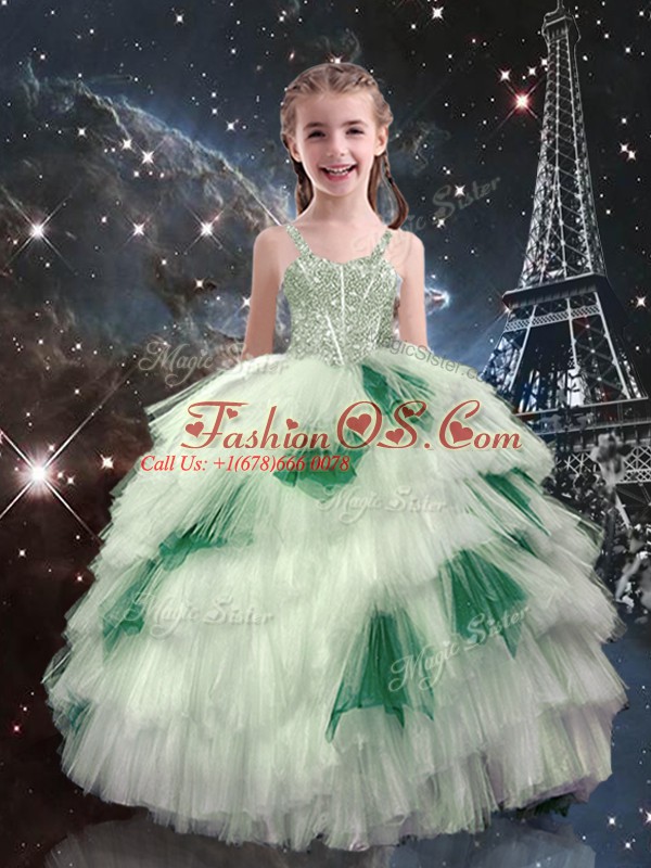 Modern White Tulle Lace Up Pageant Dress Wholesale Sleeveless Floor Length Beading and Ruffled Layers
